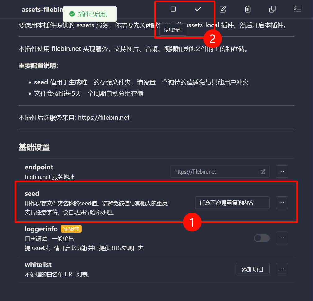 注意,开启插件之前,需要先关闭默认开启的 assets-local 插件。
